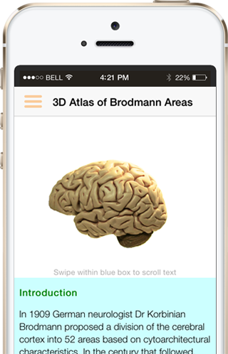Brodmann Areas of the human brain are displayed on a self-rotating brain model in this 3D atlas. The first 6 slides (covering 10 Brodmann Areas) of the full atlas are presented in this lite version.